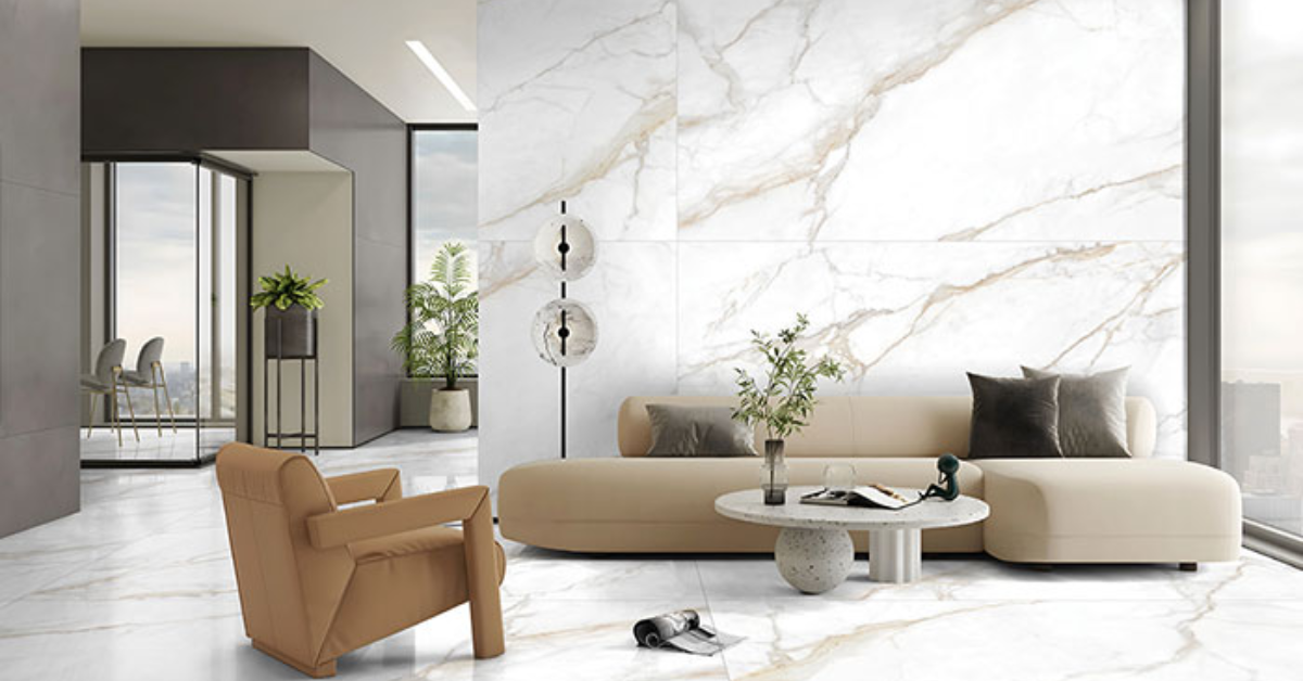 Gạch vi tinh khổ lớn thường được dùng để ốp các mảng tường trang trí như vách tivi, tường sau sofa, hoặc sảnh lễ tân. Các đường vân đá tự nhiên và bề mặt bóng của gạch tạo ra một điểm nhấn nghệ thuật, thu hút mọi ánh nhìn.