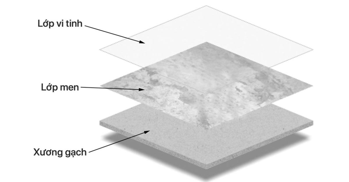 Gạch vi tinh là một dòng gạch ốp lát cao cấp, có cấu tạo gồm hai lớp chính: lớp xương gạch là porcelain cứng chắc và lớp bề mặt được phủ một lớp men vi tinh thể (còn gọi là thủy tinh) trong suốt có độ dày nhất định. Lớp men này được nung chảy ở nhiệt độ cao, hợp nhất với phần xương gạch để tạo ra một bề mặt siêu bóng, cứng, có chiều sâu và làm nổi bật các họa tiết vân đá bên dưới.